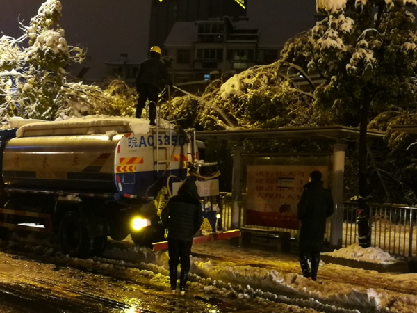 分公司在做好自身除雪救灾工作的同时,积极调配资源,参加到合肥市区公交站台积雪清扫工作。从4日上午10:00开始,分公司集结300多人,调配装载机、洒水车等各类机械设备20多台,与积雪比速度,清扫持续到5日凌晨4:00左右,共清扫了40多座公交站台。