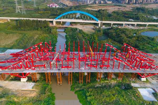 8月23日下午,随着钢桁主桥最后一块桥面板的精准落位衔接,全长239.8m的集贤路跨派河钢桁拱桥桥面成功合龙,标志着主桥已进入钢桁拱安装冲刺阶段。
