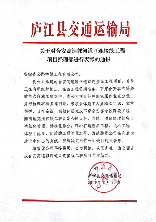 在通报中,庐江县交通运输局对两个项目优秀的工程管理水平予以肯定。汤池大道二期作为庐江县公路交通要道,具有重要的经济与社会意义。项目员工充分发扬“特别能吃苦、特别能战斗”工作作风,在7月中旬提前完成了业主单位下达的各项节点任务。郭柯路项目自开工以来努力克服各种困难,牢牢抓住关键节点段施工,精心组织、靠前指挥、日夜奋战,凭借精细化管理、标准化作业,高效优质完成了下穿合安客专铁路段施工任务。