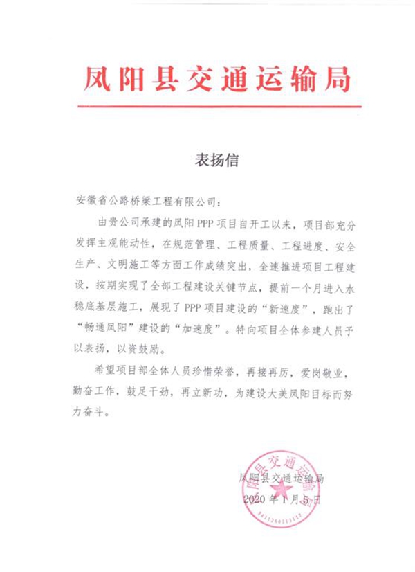 近日,凤阳县交通运输局给公司投资建设的凤阳PPP项目发来表扬信,对项目自开工以来全速推进工程建设,按期实现关键节点目标,以及在规范管理、工程质量、安全生产等方面所取得的成绩给予了赞扬。