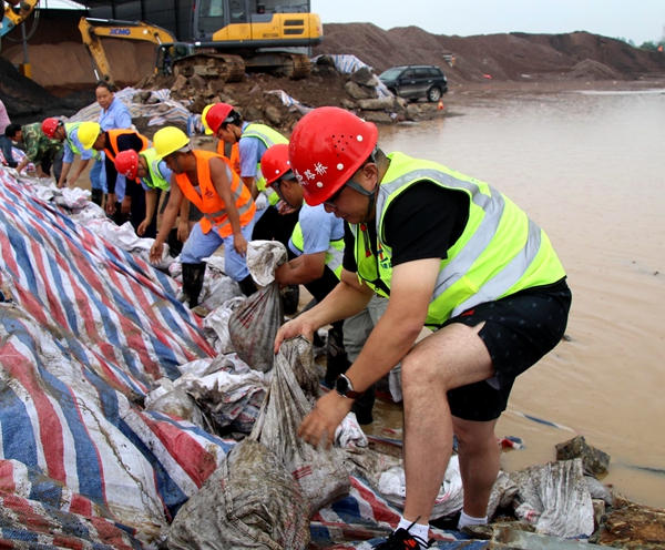 7月20日上午,项目拌合站现场,防汛抢险工作正如火如荼的开展。支部书记朱达霏正带领党员和青年员工奋战在防汛抢险一线。为了抢抓时间,尽早解决拌合站内涝问题,项目部调入两台装载机、四台铲车,实行两班倒制,人机昼夜连续奋战,突击对拌合站进行围堰加高筑坝。24日下午,一段长约300米,高1.5米的梯形围堰墙修筑工程圆满完成,成功将拌合站外的洪水挡在围堰之外。