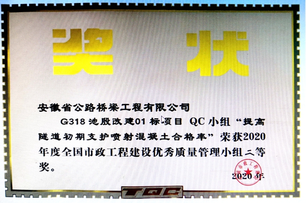近日,从中国市政工程协会传来喜讯,道路分公司G318池殷改建01标QC小组申报的《提高隧道初期支护喷射混凝土合格率》课题,荣获2020年度全国市政工程建设优秀质量管理小组二等奖。此前,该项课题还荣获了安徽省市政工程建设优秀QC小组一等奖、安徽省建设行业质量与安全协会QC成果二等奖、合肥市市政工程建设管理小组一等奖等多项殊荣。