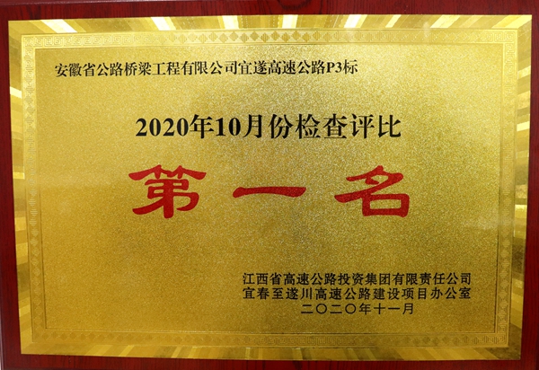近日,江西省高速集团宜遂项目办下发关于表彰十月份检查评比先进单位的通报文件,公司承建的宜遂高速P3标在综合检查评比中表现优秀,荣获路面单位第一名。