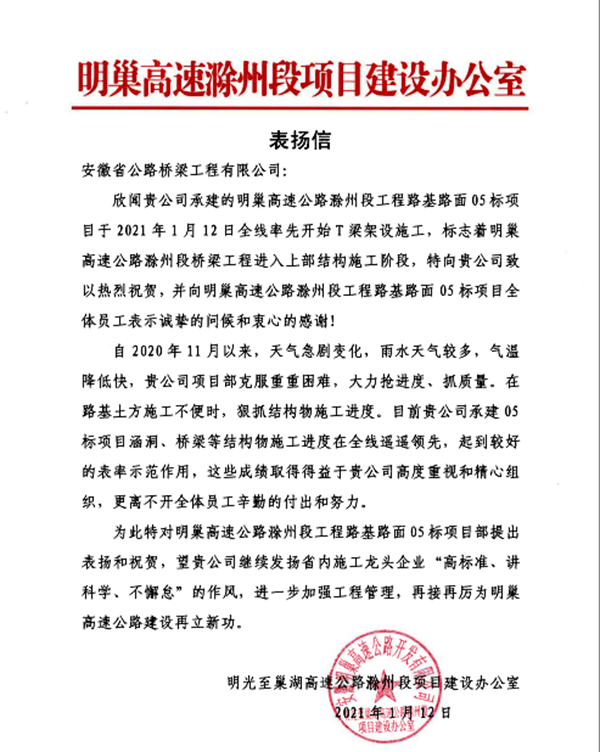 1月12日,明巢高速滁州段项目办给公司来信,对公司承建的明巢高速05标在全线率先开始T梁架设进行表扬。