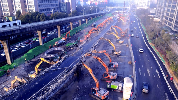 2020年12月4日22时,项目封闭施工,正式吹响大干的号角。26天后,首根墩柱顺利浇筑。2月3日,30台大型破碎机组成“钢铁战队”,仅用15个小时便完成了原计划两天才能完成的匝道拆除任务。3月25日,经过35天的持续奋战,主线桥第四联顺利架设,提前拉开了上部结构施工的序幕。