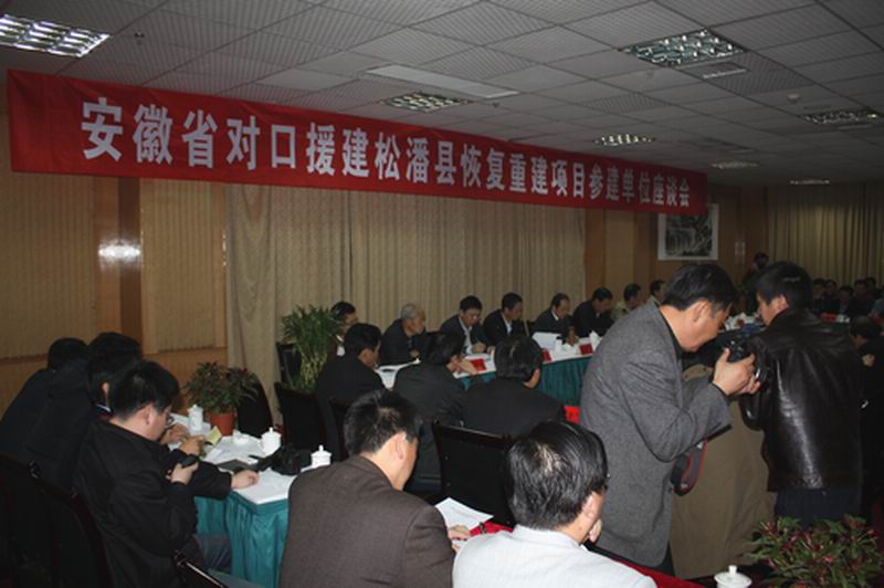 4月18下午,安徽省对口援建松潘县恢复重建项目参建单位座谈会在四川省阿坝藏族羌族自治州松潘县太阳河国际大酒店召开。安徽省省长助理、省援建办主任梁卫国,交通厅副厅长程跃辉,水利厅党组成员、纪检组长高玉宝、省经委总工程师李家寿、省国土厅处长夏炎以及省援建办有关人员,四川省建设厅副厅长王卫兰、省国土厅调研员张明旭、阿坝州副州长李川以及各参建施工单位、监理单位、设计单位代表参加了会议。公司总经理汪卫东、副总经理盛明宏也参加了座谈会。会议由省援建办副主任管早临主持。