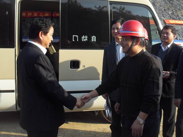 黄省长首先在施工现场听取了绩黄高速项目办主任方昱对于工程建设情况的汇报。听完汇报后,黄省长对公司和项目部的工作给予充分肯定和高度评价。他说,“省路桥公司是本省施工的龙头企业,代表本省的形象,希望你们再接再厉,继续做好规范化施工,高效管理,抓住当前机遇,努力打造优质工程,不断提升企业形象,开辟新的市场,继续做大做强。”汪总表态,“省路桥公司在黄省长的关怀下,近年来企业改制改革方面取得了一定成效,企业取得了巨大发展,我们将继续做好施工规范化、精细化管理,在省领导的关心与支持下,我们一定会抓住机遇、迎接挑战,把企业做大做强”。