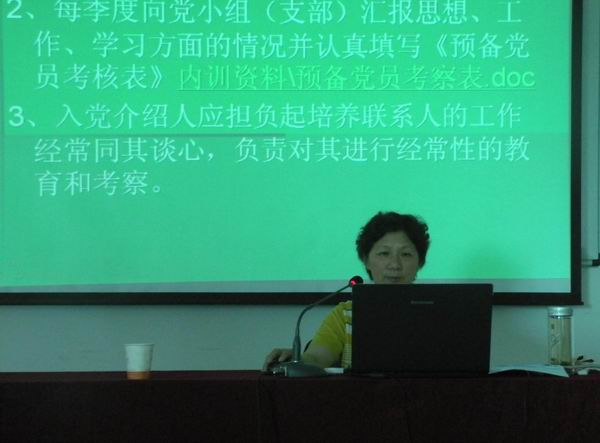 党委办公室主任刘昀主持了培训会,并就发展党员工作程序,作了专题讲座。刘主任通过PPT课件,系统的介绍了党员发展程序,从制订发展党员的工作计划开始,到预备党员转正、整个入党材料存入个人档案,以及最后的责任追究都作了详细介绍,让与会人员对发展党员工作的程序有了清楚的了解。随后,大家一起观看了《欲之害——段义和腐败案件警示录》。专题片揭露了段义和利用职务便利大肆索贿的腐败行径,深刻揭示了腐化堕落的思想根源和蜕变轨迹。通过观看警示教育片,使大家接受了一次深刻的思想教育和精神洗礼,进一步认识了在新形式下反腐倡廉建设的重要性。
