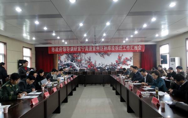 进行现场了解之后,虞市长立即在孙埠镇政府主持召开了相关工作会议。会议过程中,虞市长认真听取了孙埠镇党委史书记、镇政府胡镇长的工作汇报和我部项目经理张庆书所作的有关施工进展情况以及当前面临的重大客观困难的情况介绍。随后立即组织了讨论解决问题的对策。虞市长指出:作为政府方面,宣城市交通局、宣州区政府以及孙埠镇政府必须从宣城市大局发展的角度,提高认识、明确责任、开通思路、多想办法、强化措施,保证在月底前完成宣宁高速02标段红线内房屋拆迁工作,为安徽省公路桥梁工程公司提供一个畅通、稳定的施工环境!