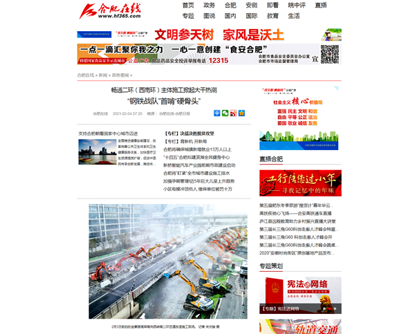 安徽路桥公司承建的畅通二环(西南环)工程是目前合肥市最重要的市政工程之一。自项目建设以来,备受社会各界的高度关注。特别是在春节期间,项目铆足干劲、大干正酣的诸多场景,得到人民网、中国日报、学习强国、安徽卫视、中安在线、安徽网、新安晚报、澎湃新闻、合肥日报等众多媒体的全方位、多角度报道。