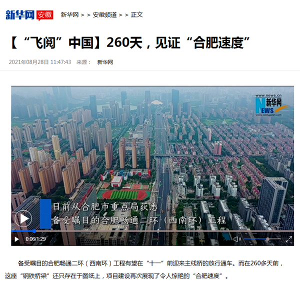 8月28日,国家级主流媒体再次聚焦公司承建的重点工程建设,《新华网》以《“飞阅”中国260天 见证“合肥速度”》为题,报道了公司承建的畅通南二环(西南环)项目建设进展情况。