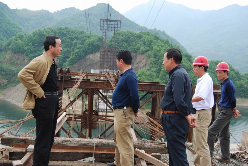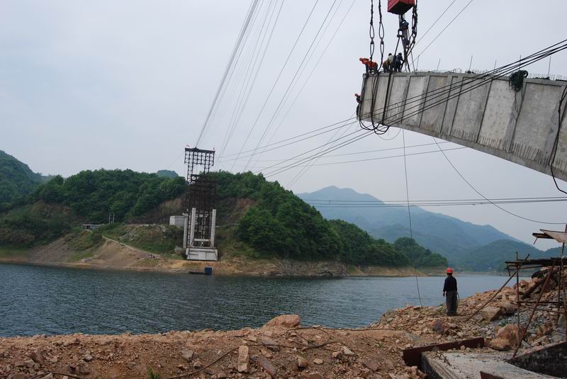 2009年4月30日上午10:30,宁静的大别山革命老区金寨县梅山水库上空传来了清脆的鞭炮声,绚烂的礼花把青山绿水映衬得更加多姿。备受社会关注的金寨县金桃大桥主桥第二孔,即桃岭跨第一片重达75T的箱拱梁被缓缓吊起,在众目凝视下稳稳就位,为“五.一”国际劳动节献上了一份厚礼。这预示着金桃大桥又取得了一个实质性的进展和阶段性的胜利。金寨县交通局张传旭局长、王学军副局长、总监贾淳忠等在公司总经济师杨文柱的陪同下,现场观看了整个吊装过程。下午,金寨县人大副主任石本德、县委常委、常务副县长赵权分别到场表示祝贺和慰问。