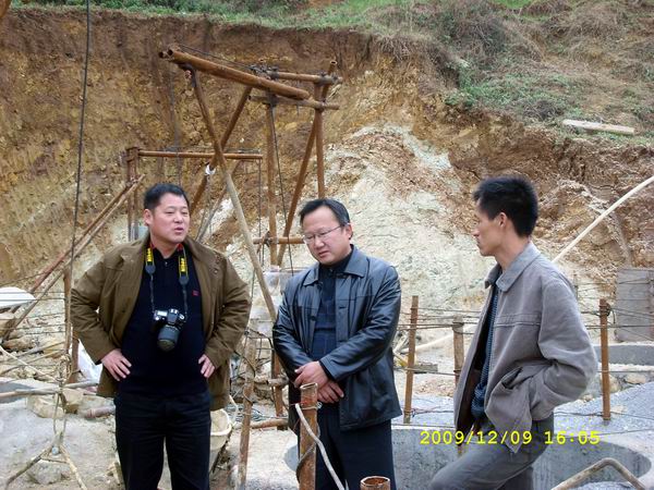 9日下午,孙总陆总一行稍做休息之后,便在我部项目经理刘晓晗、财务经理李强等人员的陪同下,对我部的岩子脚大桥4号、5号主桥墩挖孔桩处、雨坝隧道、拌和站料场、标尾路基挖土方处做了认真的检查。孙总对我部开工以来的进展速度和取得的成绩给予肯定。当前我项目4号墩挖孔桩16根桩基已完成14根,剩余2根也即将成孔;5号墩挖孔桩也完成一半以上;隧道便道的修建速度和路基填方速度都较快。孙总也就我部的不足之处提出要求,要求我部应更加主动积极地解决地方问题,加快桥梁上部施工队伍的选择,保证桥梁施工的连续性。在施工过程中要确保施工安全,特别是隧道进洞及石方爆破,要有专项安全方案,在确保施工质量的同时要做好文明施工,展示路桥风采。
