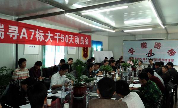 会议首先下达了大干50天的施工任务目标,并公布了相应奖惩措施,要求各施工班组务必按质按时完成施工任务。随后,RA3驻地办驻地工程师吴胜和A7监理组组长万军分别对大干50天作出指示。最后,项目经理刘大雷从工程进度、质量和安全等方面进行了总结并提出要求,强调了施工过程中安全、质量、进度的重要性,三者要同时抓,要加强环保与文明施工,建立一个和谐的施工环境。