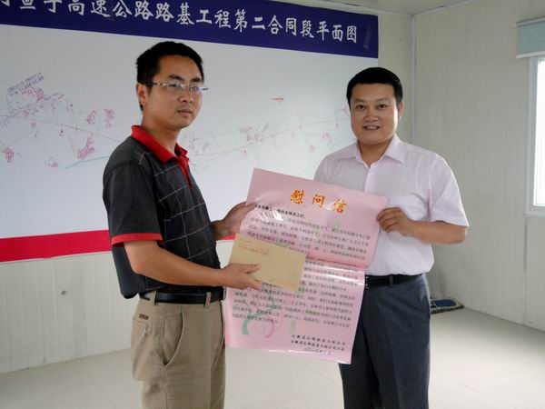 胡主席一行在到达项目部后,首先召集了项目部领导及部分技术骨干在会议室召开了一个简单的座谈会。会上,胡主席代表公司领导首先对02标项目部的五十多名干部职工传达了公司领导的关怀:“季节特殊,条件艰苦,同志们辛苦了!”随后,胡主席向王守武总工递交了总公司工会给宣宁02标项目职工的慰问信及慰问金,总工王守武代表项目部全体员工对总公司的慰问表示感谢。