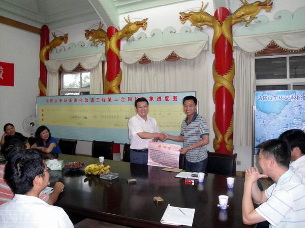 最后,在一阵热烈的掌声中,胡主席向我部项目经理冷峰递交了慰问信和慰问金。