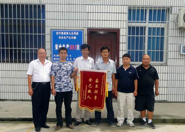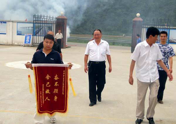 为感谢救人宜昌汽修厂送锦旗到宜巴09标 发布时间:2010年07月20日 来源:宜巴09标 发布人: 作者:晏永超 浏览:4439次 7月15日,公司宜巴09标项目部礼炮声隆隆,喜气洋洋。宜昌市夷陵区雾渡河镇富贵汽修厂为感谢公司员工奋不顾身抢救落水人员特送来锦旗,锦旗上写着“奋不顾身,舍己救人”。 6月26日,福贵汽修厂员工驾车经过我项目二工区马家河二号桥附近时,突然冲入河中,我部员工王雪松、韦祥峰等见此情景,奋不顾身跳河救人,同时项目部积极调配车辆设备,奋力施救,经过一个小时的救援,驾驶员获救。夷陵区电视台对此进行报道,引起了强烈的社会反响。 王雪松、韦祥峰等人在接受夷陵区光电中心记者采访时谦虚的说,面对危险,任何人都会主动施救,我们只是做了安徽路桥人应该做的事情。一个人就是一面旗子,王雪松、韦祥峰等就是安徽路桥的一面旗子,飘扬在宜巴高速路上。