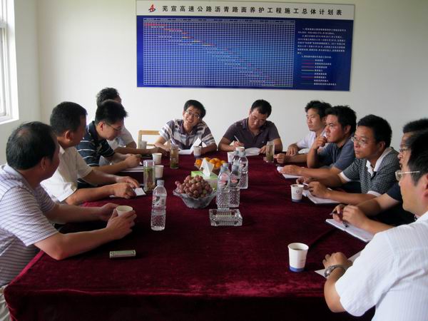 结束了对前后场的现场视察后,曹部长一行在项目部会议室召开了工作座谈会议。会上交投集团养护部曹部长、界阜蚌改建办张主任、芜宣管理处养护部张部长、驻地办刘组长作为代表分别就目前施工中质量控制的要点以及施工工序中需注意的几个方面做了发言,并就此进行了深入的交流与探讨。