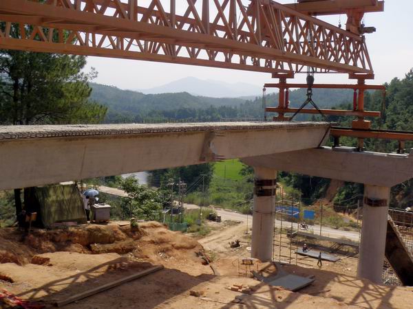 为了确保架梁工作的顺利开展,项目部领导到现场指导架桥机的拼装、检验等工作,通过对架梁人员进行分部分项技术交底,让所有现场作业人员都能做到熟捻于心。经过施工人员精心施工,努力奋斗,于10月2日完成架桥机拼装,10月3日完成调试。10月5日,在项目部领导、监理和驻地办领导的共同指挥下,我标段首片箱梁成功架设。现场鞭炮齐鸣,掌声如雷,为国庆增添新的喜庆。