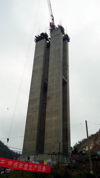 4号桥墩开工以来,项目部全体员工克服地形限制引起的交通运输不便、作业场地狭窄、雷暴天气频繁、地方关系复杂等不利因素,攻克了机制砂泵送和高墩施工的垂直度控制等技术难题,连续奋战170多天,确保了4号主墩在保证质量和安全的前提下顺利封顶。