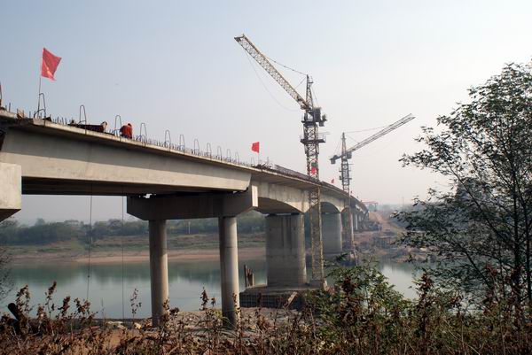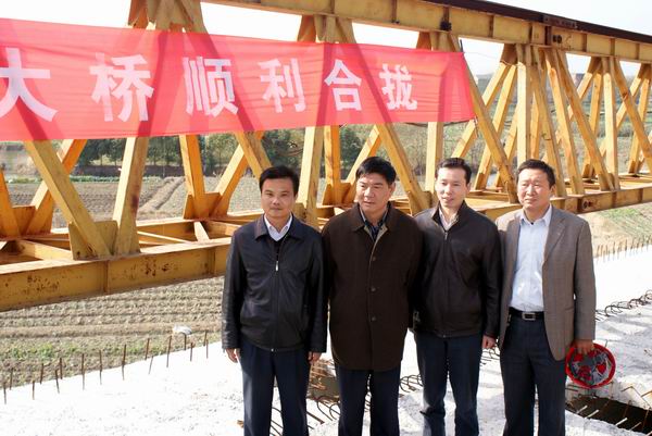 青弋江大桥全长454米,净宽11米,结构形式为30×10+70+42×2的简支箱梁与现浇悬臂桥。该工程于2007年开工,前期由于施工条件的限制和其它不利因素,工程进展颇不顺利。后来在公司领导的大力支持下,全体施工人员上下合力,积极创造条件进行施工,全桥终于顺利合龙。盛总在合龙现场指出,虽然大桥已顺利合龙贯通,但后期任务还相当艰巨,桥面、护栏、桥头搭板和护坡等都需要抓紧施工,在保证质量、保证安全的情况下,组织力量加快施工进度,确保实现元月通车的目标。