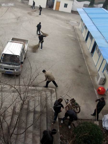 同志们各持工具,有说有笑,一时间项目部呈现出一派热火朝天的景象。经过将近3个小时的清理,项目部楼道、厕所、花坛、广场都焕然一新。