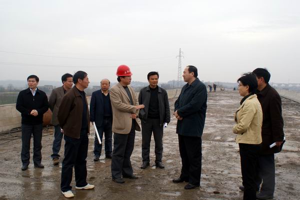 319上午920,芜湖市政府副市长朱诚在市交通局、公路局、芜湖县政府等相关领导陪同下,来我青弋江大桥视察指导工作。朱市长一行下车后步行上桥,看到我大桥护栏、砼桥面已全部完成后,非常高兴。在听了基本情况汇报后,他指出:这座桥是这条路的龙头,希望能早日通车,并对项目部提出要求,415一定要完成沥青路面及附属工程,确保简易通车。