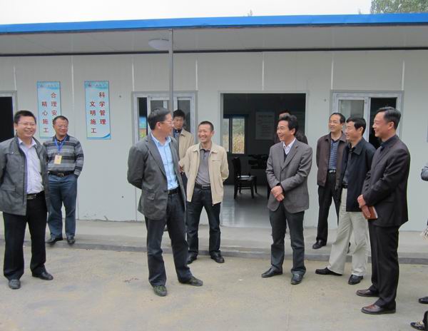 王传鹏一行先来到我标段正在建设中的预制场拌合站,并听取了项目经理杜海峰的汇报。接着来到我标段项目部,调研项目驻地建设情况,就项目驻地建设作出具体指导。他要求项目驻地的实验室及相关配套设施要尽早完备,并指出在地方事务上,出现问题要及时与县指和乡镇进行沟通,协调解决。同时,他要求县指继续做好各项协调工作,确保蚌固路改造工程于10月底顺利施工。