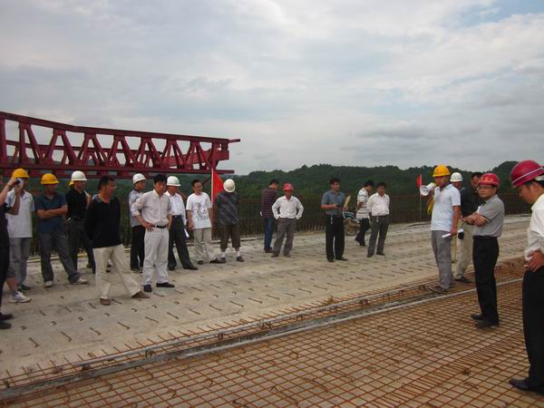下午15:30,在大广高速龙杨段项目办、高驻办相关领导带领下,全线各高驻办、施工单位主要负责人徒步参观了我标江口大桥施工现场。实地考察中,我标项目经理罗权针对水混凝土桥面铺装施工情况作了简要介绍,并就部分施工细节问题与观摩团进行了深入交流。