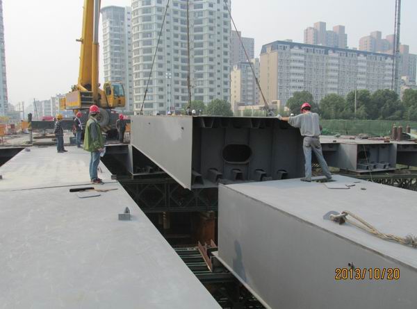 回顾跨南淝河桥钢箱梁的施工过程,项目全体员工共同努力,克服了许多技术和吊装难题。工程前期现场勘查发现,桥梁东侧位于现状110kv高压线下,河南岸的东侧和西侧分别有高压铁塔和污水泵站,大吨位吊车无法满足安全施工条件。项目部技术人员根据桥型特点和场地特殊环境、设备要求, 上报设计单位将原设计20+30+20m三个制作段架设变更为16+10+18+10+16m五段架设,并通过专家论证评审,解决了关于钢箱梁架设存在的重要疑难。后期架设时为了确保吊装100%安全,杜绝安全隐患,通过项目部与多方努力协调,在10月20日架设东侧110kv高压线下钢箱梁时,高压线暂停供电。全力做到放心安全的架好每一片梁。